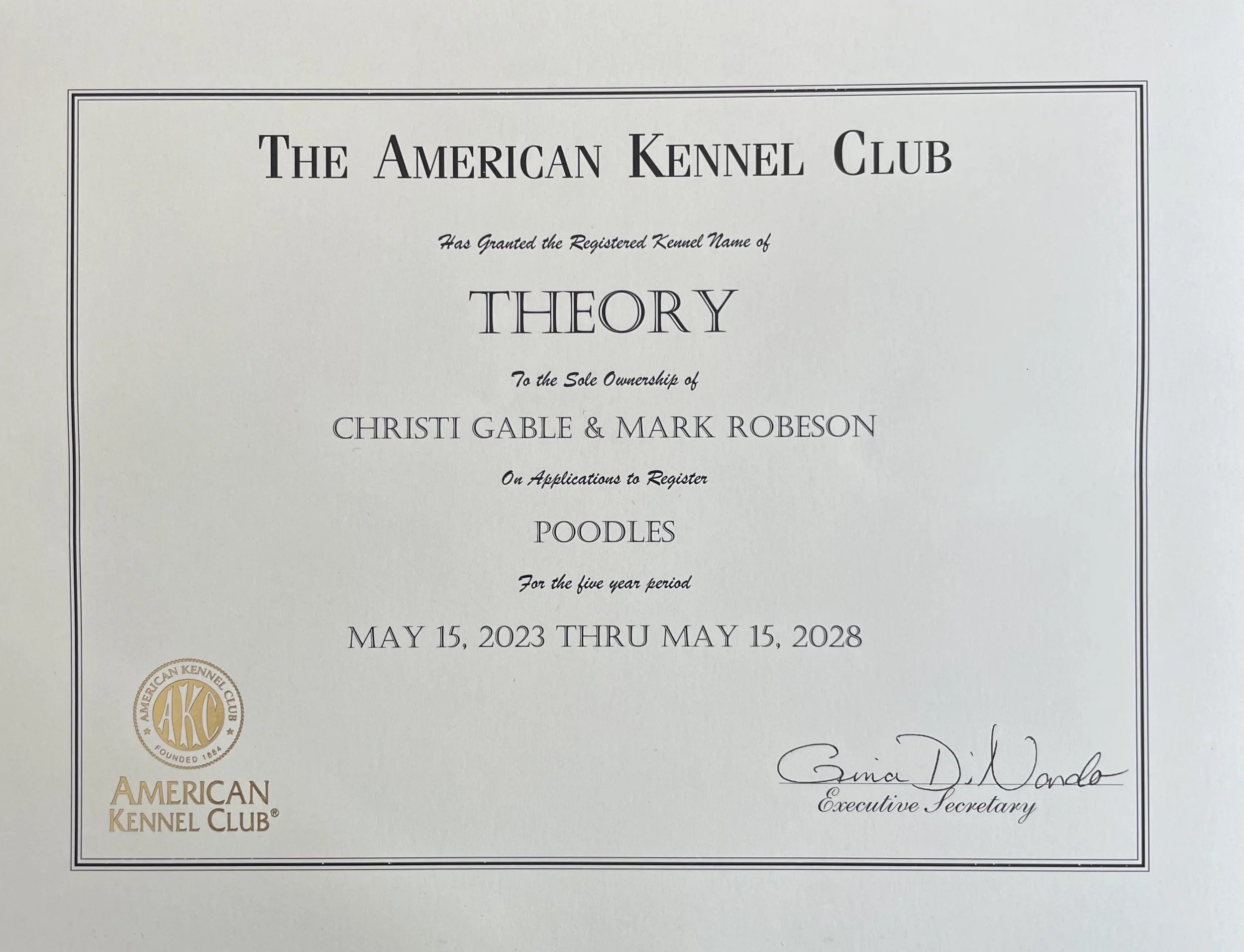Theory Standard Poodles, founded by Christi Gable in 2005, is a proud preservation breeder striving to breed healthy, well-rounded Standard Poodles in line with the AKC Breed Standard in an effort to improve upon the health, temperament and quality of this amazing Breed!